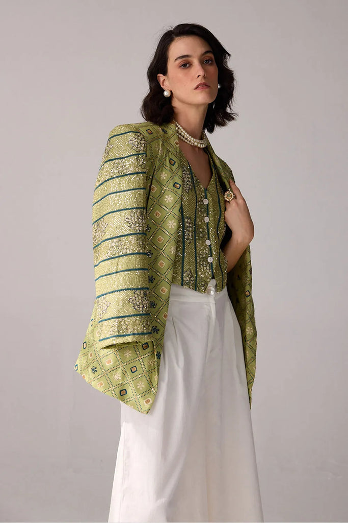 The label’s signature flair for color, embroidery, and movement has made it a favorite among celebrities, including Anushka Sharma, who embodies the effortless boho-chic spirit in her short green party dress from Verb.