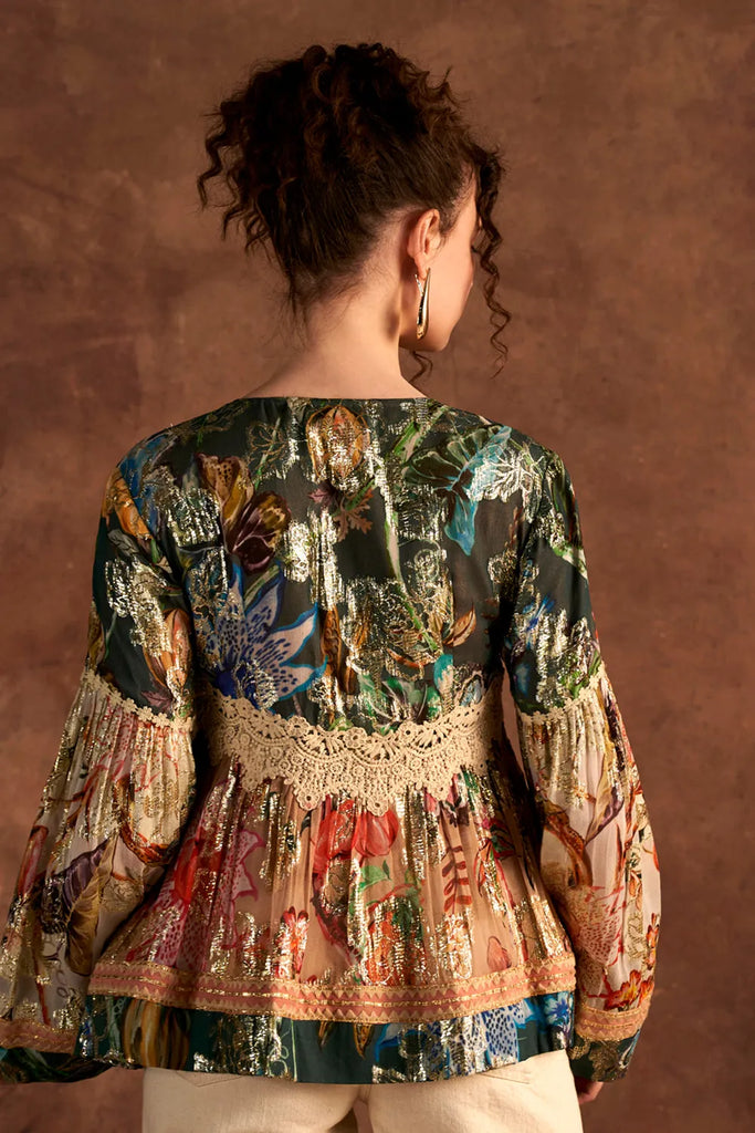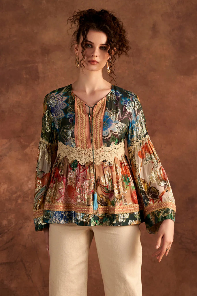 A gorgeous multi-printed blouse in Viscose Lurex Georgette with lace & thread detail for the diva in you.
