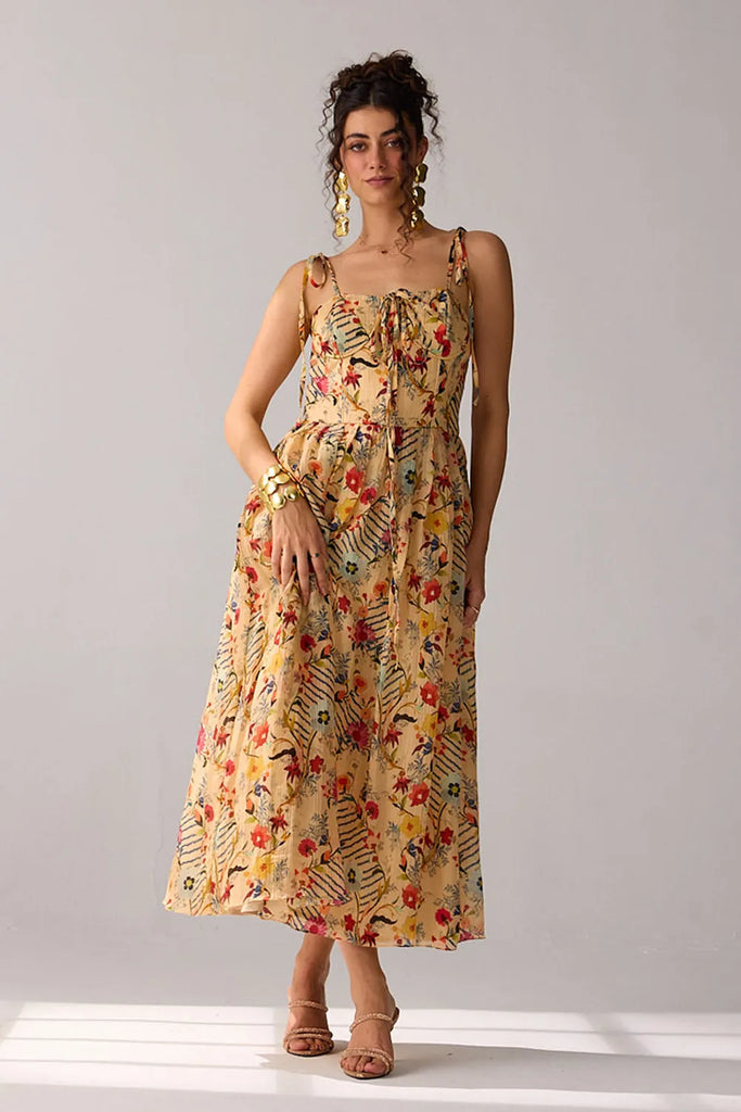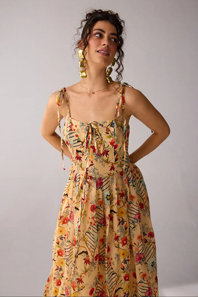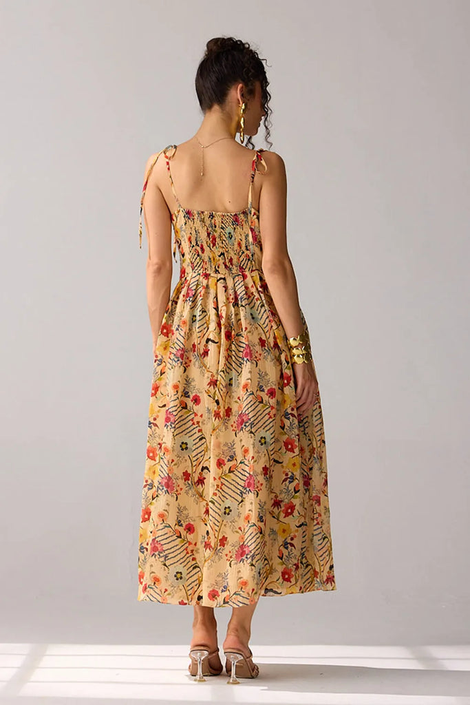 This corset-fitted maxi dress features an adjustable smocked back for a tailored fit. Ideal for a summer getaway or a stylish luncheon with friends, it combines elegance and comfort for any occasion.