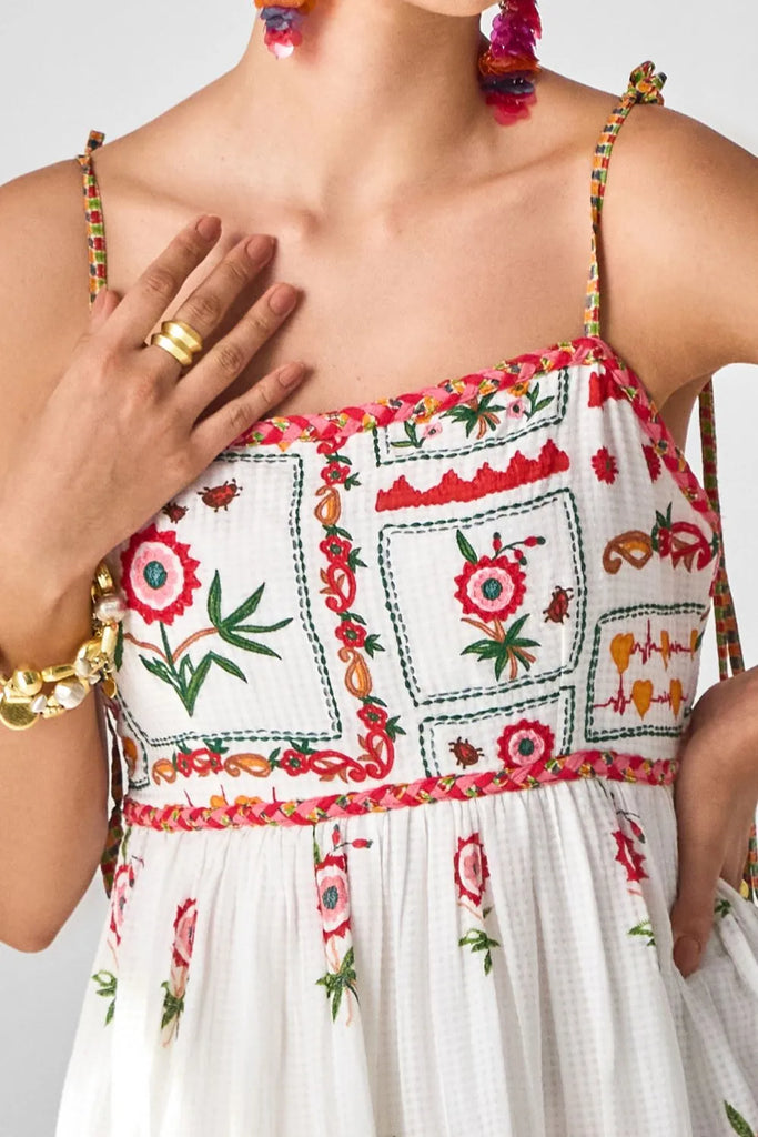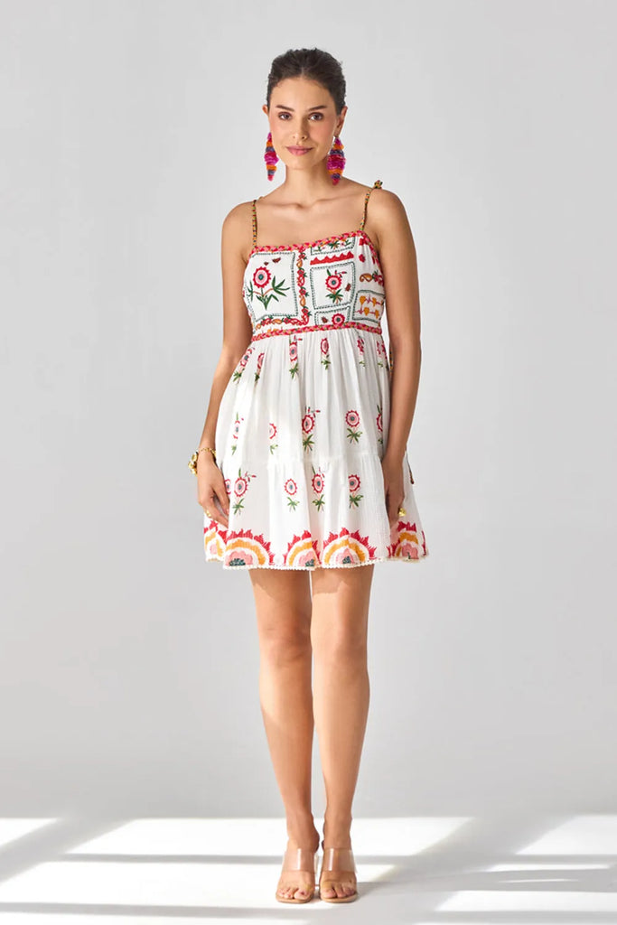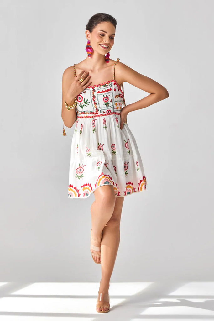 This flirty ivory mini dress in voile features an embroidered torso and delicate braided detailing, offering a playful yet elegant look. Perfect for adding a touch of charm to any occasion.