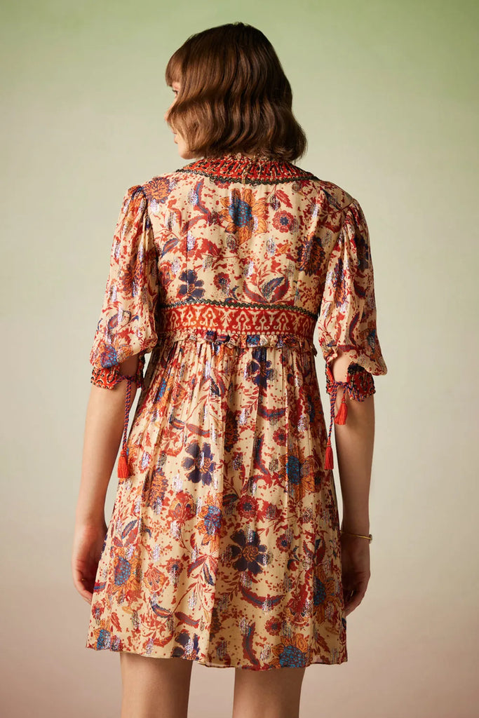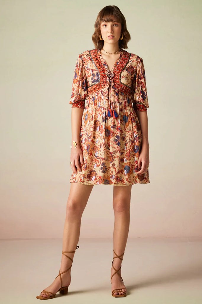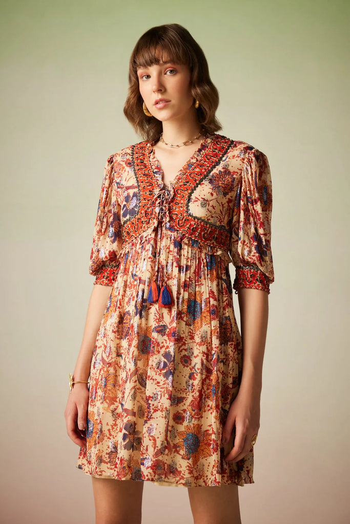 Step into the spotlight with the Abeni Mini dress. This floral printed embroidered mini dress in beige exudes femininity and grace. Made from viscose lurex GGT fabric, it offers a comfortable and luxurious fit. Perfect for a party or special occasion, this dress will make you feel confident and beautiful.