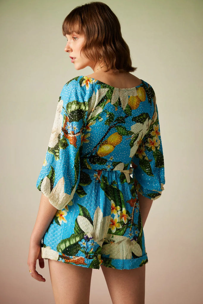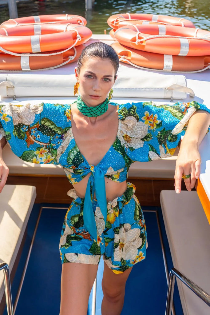 Make a fashion statement with the Alexis Blouse & Shorts Set. The cyan blue sequinned GGT fabric features a multiprinted design and a front tie-up detail, creating a chic and trendy look. The cropped length adds a playful touch, making it perfect for a party or a night out. Pair it with high-waisted pants or a skirt for a fashionable ensemble.