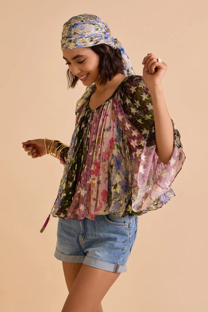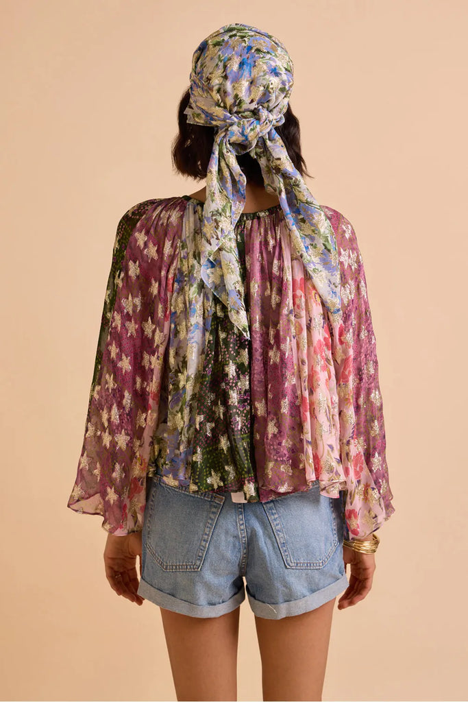 This front-open color-blocked jacquard blouse is versatile and chic, perfect for layering or wearing on its own with trousers or shorts. Its bold design adds a stylish touch to any outfit.