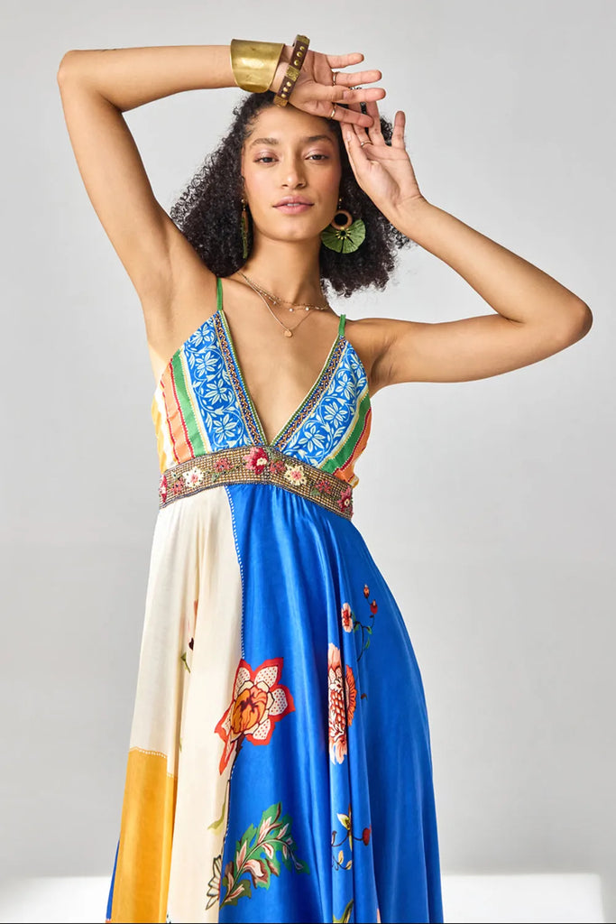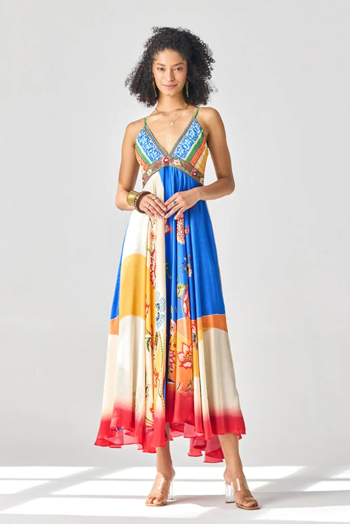Effortlessly stylish, this plunging neckline maxi dress features an engineered floral print, an embroidered beaded neckline, and an adjustable smocked back for a perfect fit. Ideal for holidays or casual day wear, it pairs beautifully with a light jacket for added versatility.