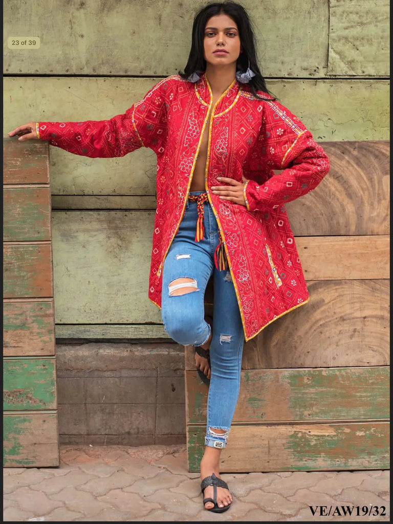 Embrace the vibrant spirit of the holidays with our Banjari Quilted Jacket in a rich Crimson Red hue. This folksy printed jacket boasts intricate beads detailing that adds a touch of allure to your ensemble. Crafted from luxurious Khadi Silk, this jacket is not only stylish but also comfortable, making it the perfect choice for your holiday adventures.