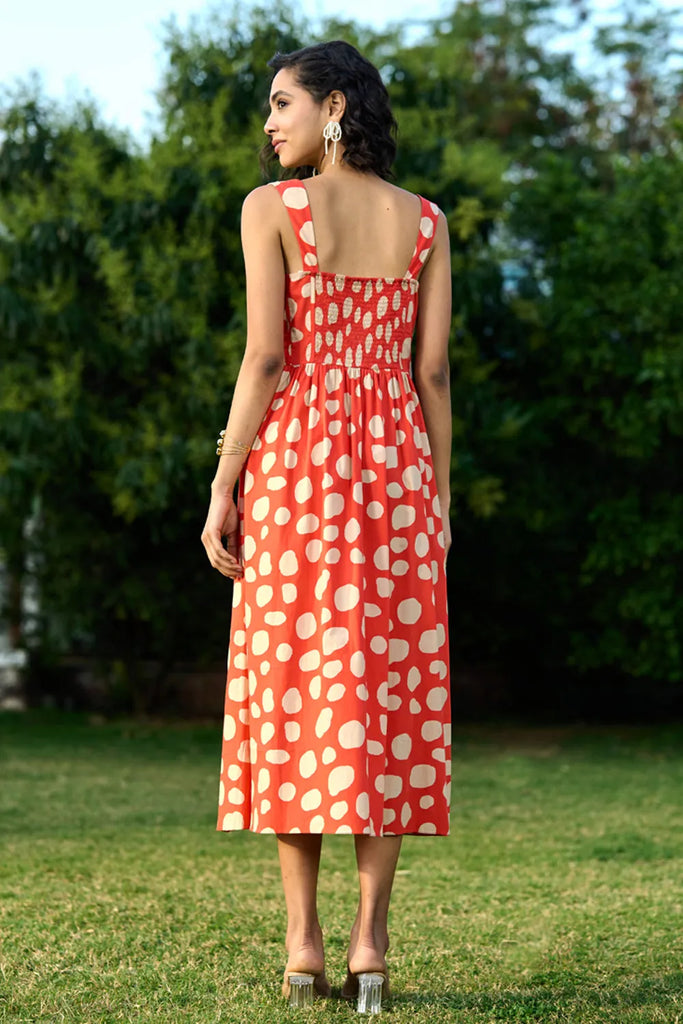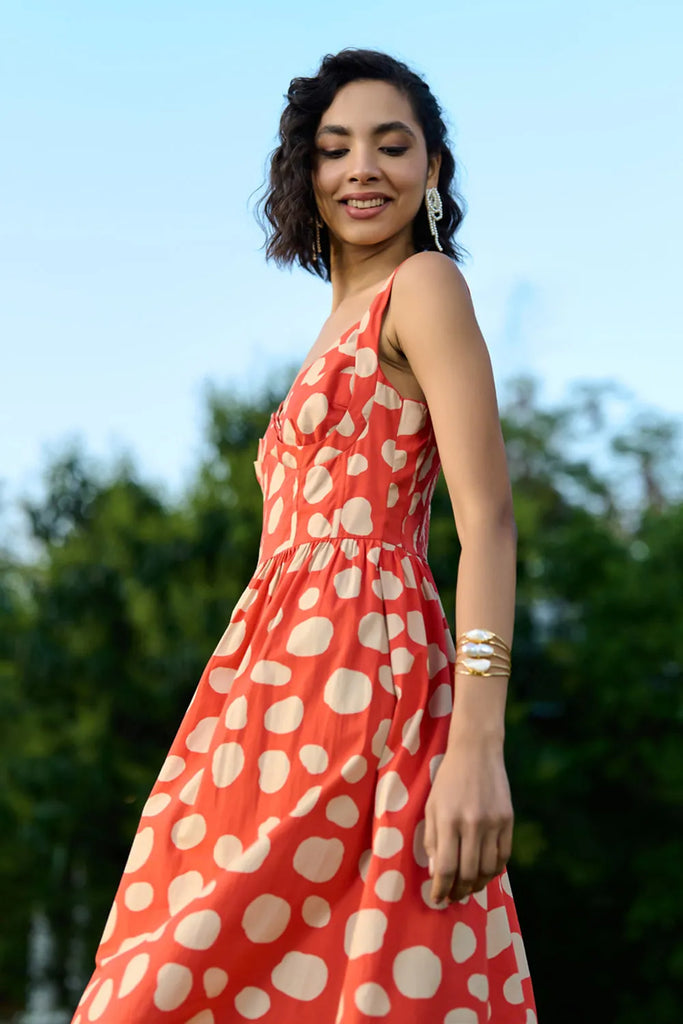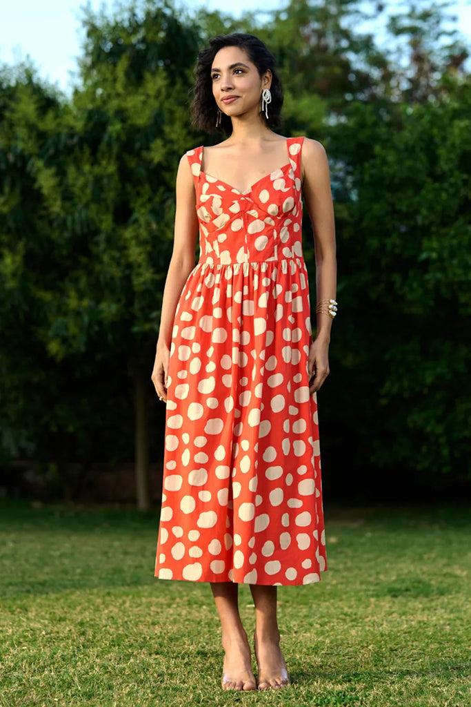 This coral red sweetheart neckline dress in cotton poplin combines classic charm with a modern twist. Light, breathable, and effortlessly chic, it's perfect for sunny days and casual outings.