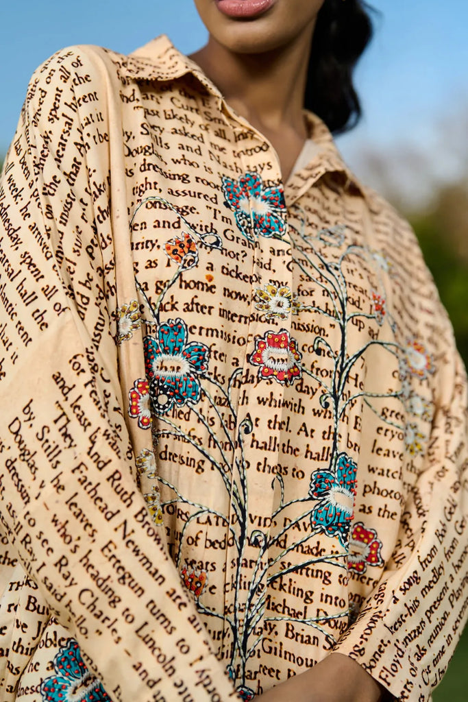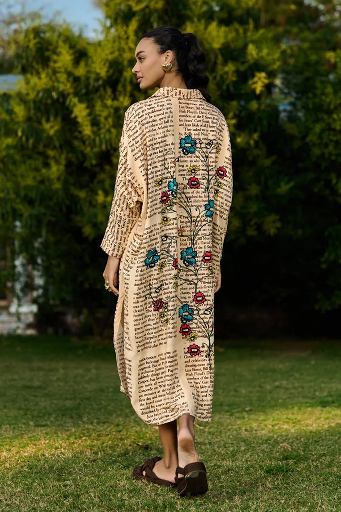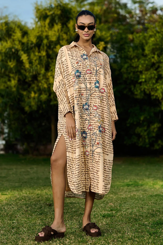 This one-size beige vintage newspaper floral placement printed midi-length shift dress fits sizes XS to XL. With its timeless design and flattering silhouette, it’s the perfect blend of vintage charm and modern elegance.