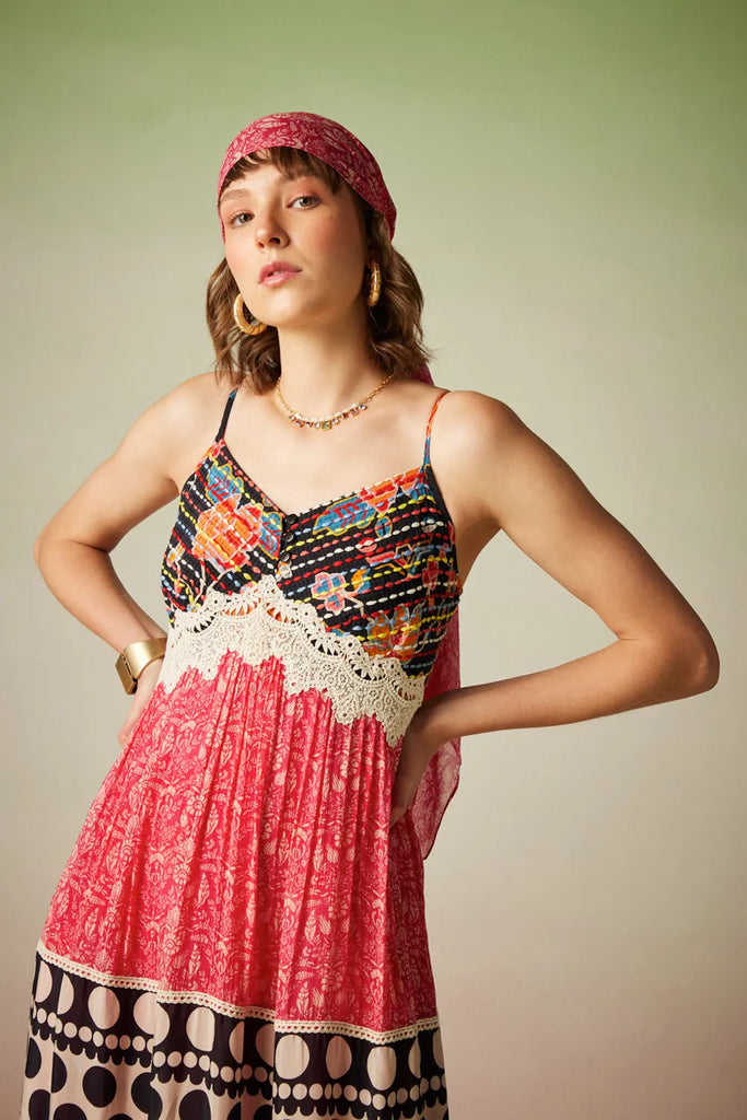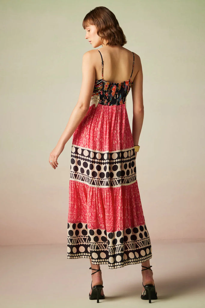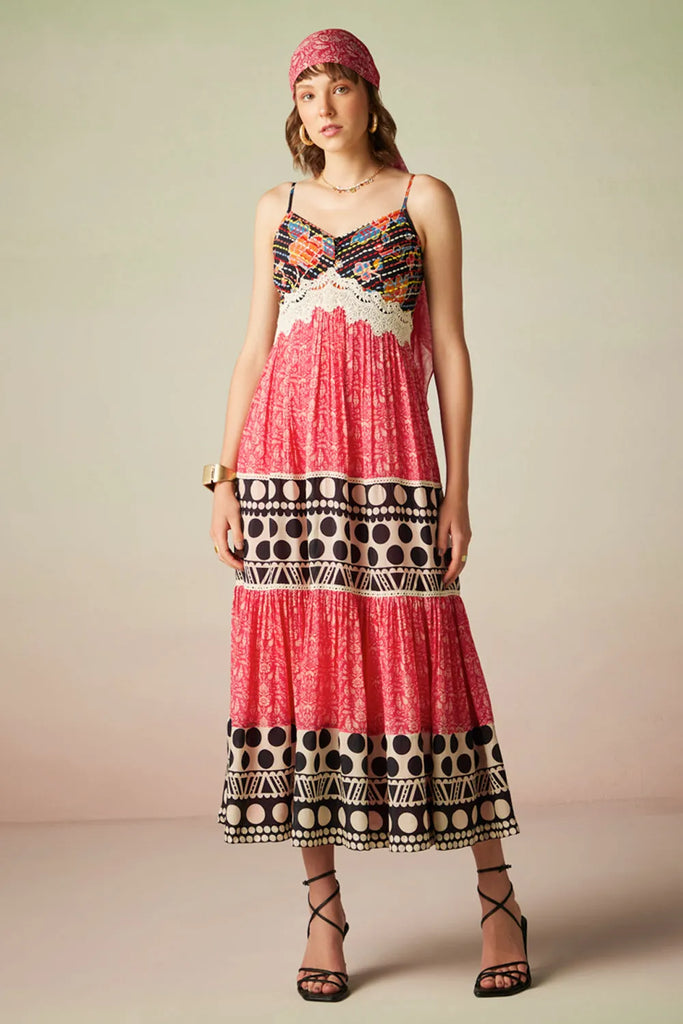 Make a statement with the Danya Maxi Dress. This multi-printed spaghetti dress features lace detailing and embroidery, exuding femininity and grace. The hot pink viscose GGt fabric offers a comfortable and flattering fit. Perfect for resort getaways or holiday occasions, this maxi dress will make you feel stylish and confident.