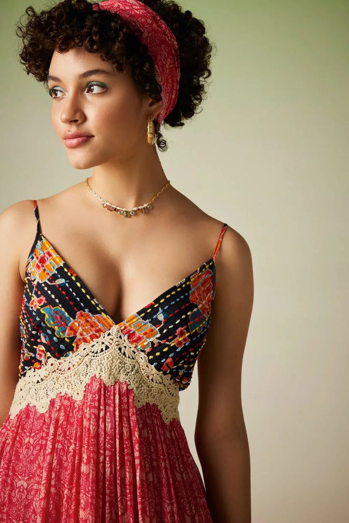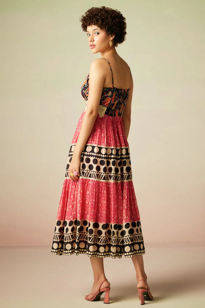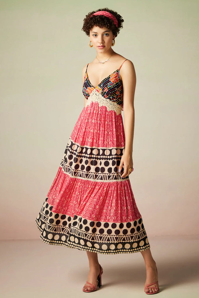 Make a statement with the Danya Maxi Dress. This hot pink dress features a multiprinted design, spaghetti straps, and intricate thread detailing in the yoke, creating a unique and eye-catching look. The lightweight cotton chiffon/GGT fabric offers comfort and elegance. Whether it's a holiday party or a special occasion, this dress will make you feel confident and fabulous.