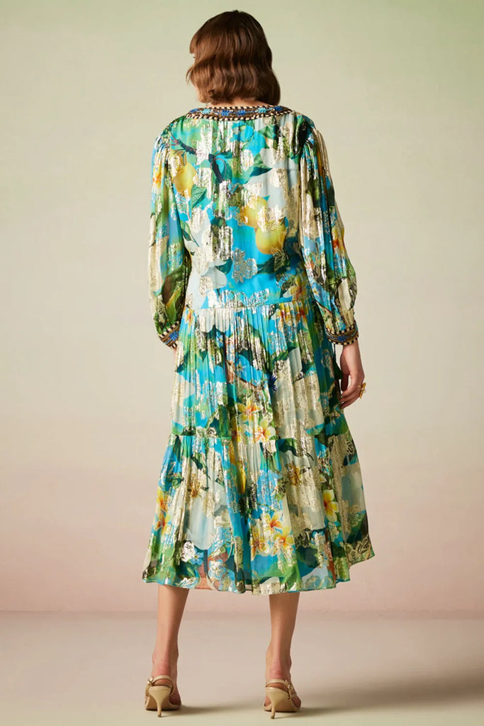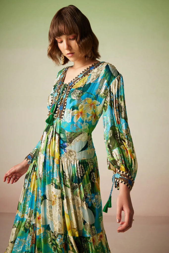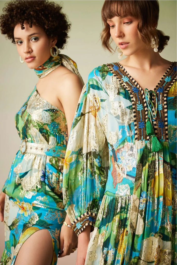 Celebrate Ramadan and festive occasions with the Eshal Kaftan. This multiprinted kaftan dress features sequin bead detailing, adding a touch of glamour and elegance. The cyan blue viscose lurex GGT fabric offers a comfortable and luxurious fit. Step into the festivities with this stunning kaftan dress.
