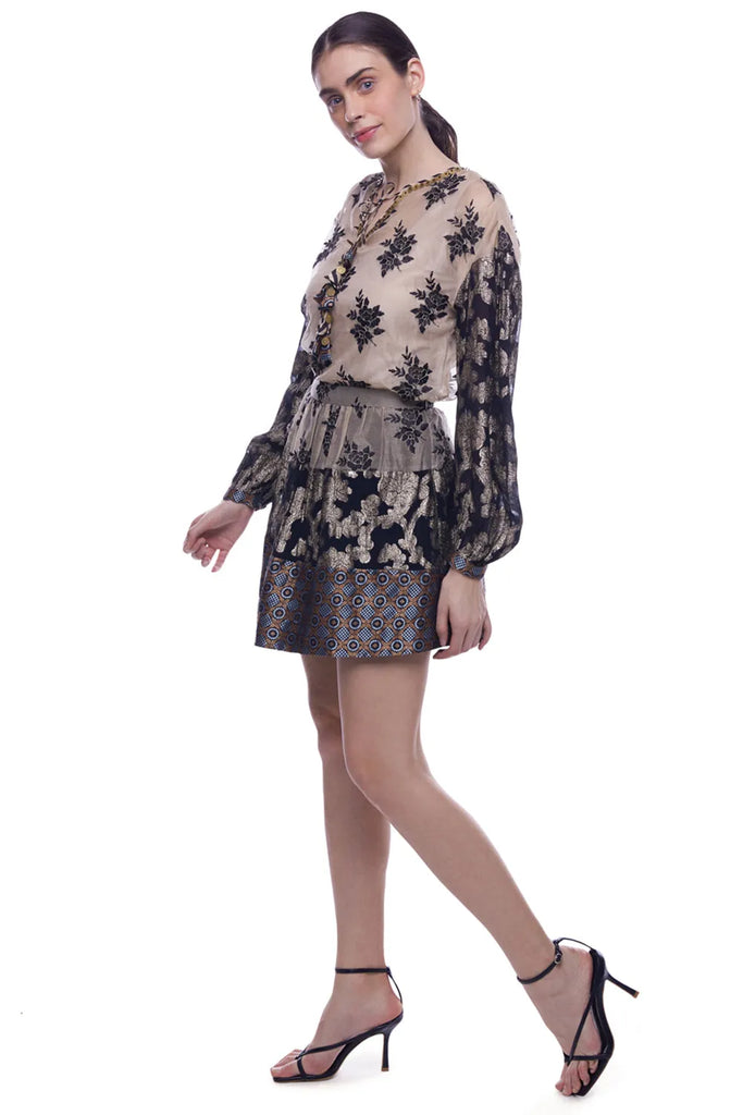 Exude elegance with our Estella Embroidered Sheer Blouse featuring Jacquard sleeves in an enchanting ivory shade and Viscose Lurex fabric. This blouse is a sophisticated choice for your holiday celebrations.