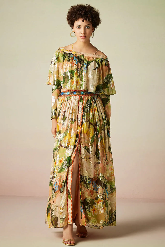 Add a touch of shimmer to your holiday wardrobe with the Hailey Blouse. The coral pink viscose lurex GGT fabric features a multi-printed shimmer design, exuding a playful and glamorous vibe. The off-shoulder style adds a flirty touch, making it perfect for holiday parties. Embrace your inner fashionista and let this blouse be the centerpiece of your party look.