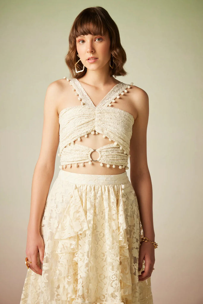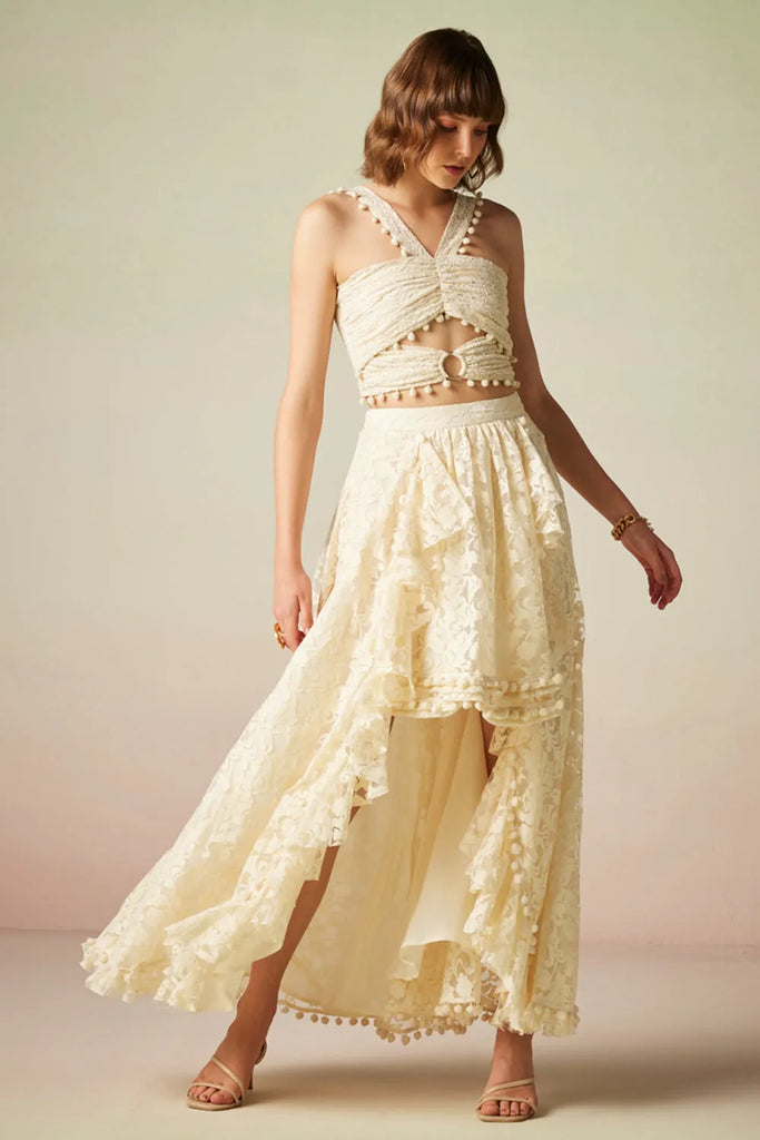 Add a touch of elegance to your holiday wardrobe with the Heidi Skirt. This ivory skirt features lace detailing and an asymmetrical design, creating a sophisticated and stylish look. Made from viscose, it offers a comfortable and flattering fit. Pair it with a blouse or a stylish top to create a chic and fashionable ensemble.