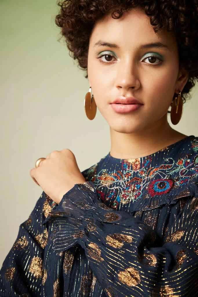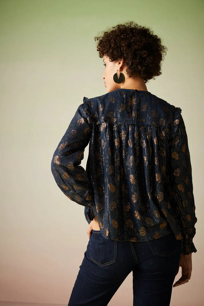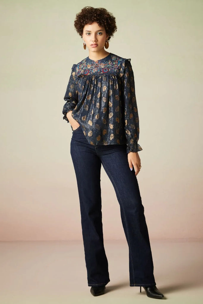 Make a fashion statement with the Julien Blouse. This multi-printed lurex blouse in navy blue features an embroidered design, adding a touch of elegance and sophistication. The viscose lurex GGT fabric offers a luxurious and comfortable fit. Pair it with pants or skirts for a stylish and glamorous ensemble.