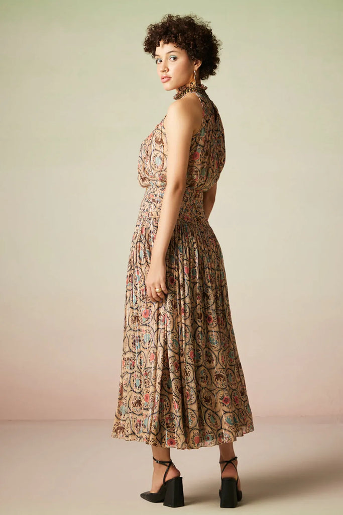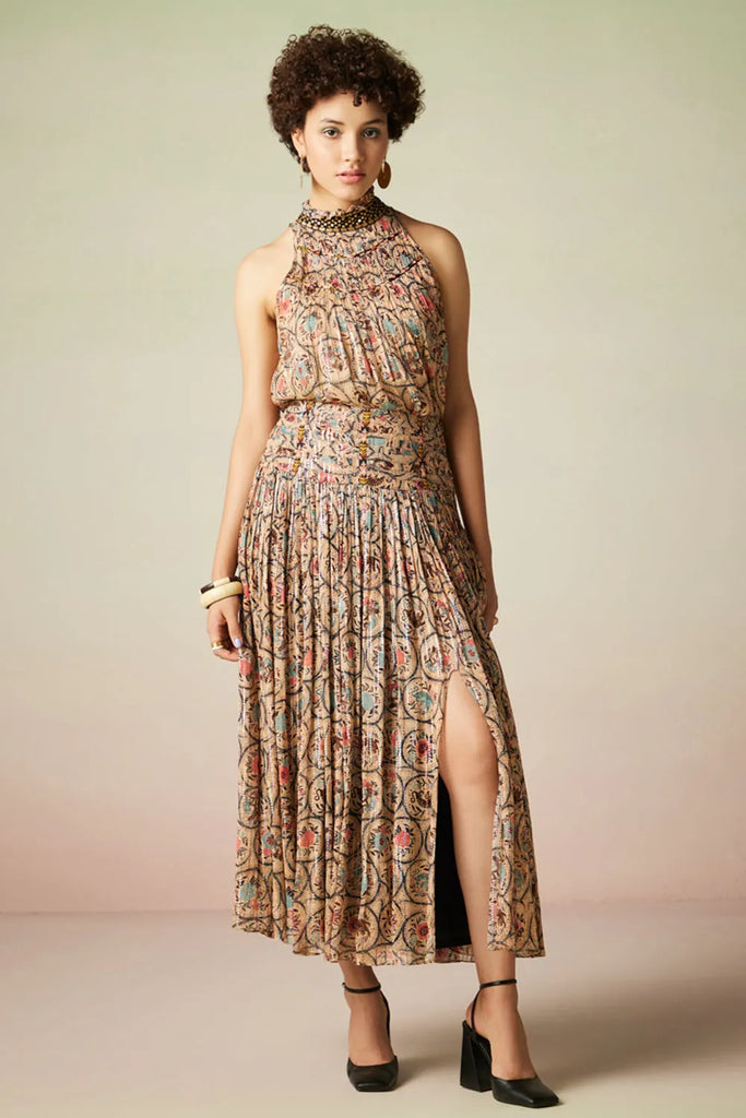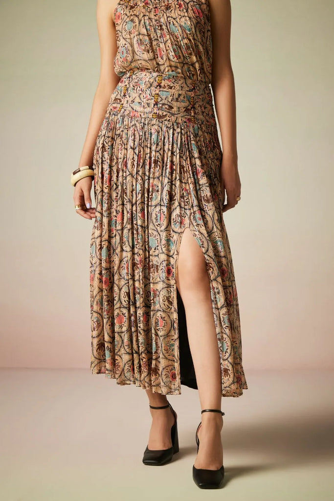 Complete your holiday look with the Amalea Skirt. Made from beige viscose lurex GGT fabric, this multiprinted skirt exudes elegance and style. The lurex detailing adds a subtle shimmer, while the comfortable fit ensures ease of movement. Pair it with a blouse or a stylish top to create a fashionable and sophisticated outfit.