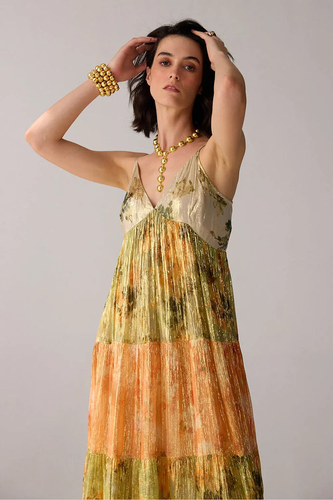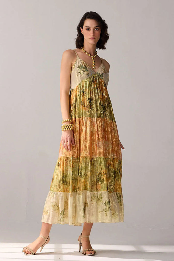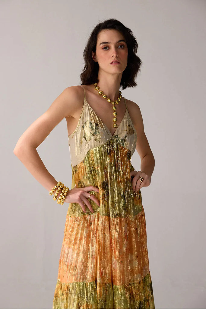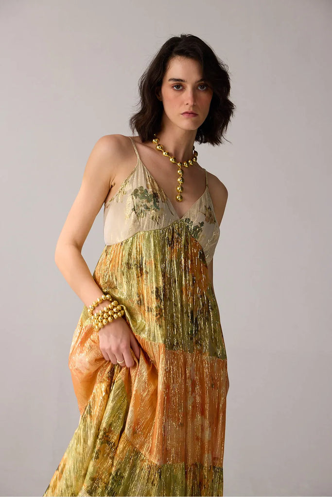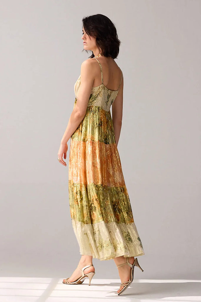 A spaghetti strap dress that combines the allure of golden lurex with a touch of multicoloured vibrance, creating a timeless dazzling effect.
