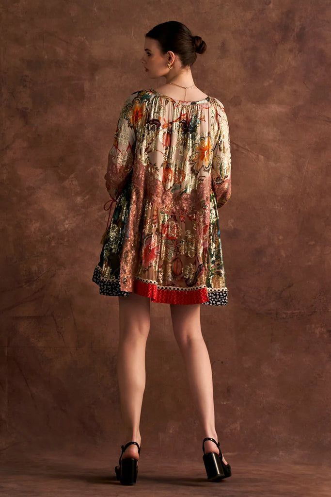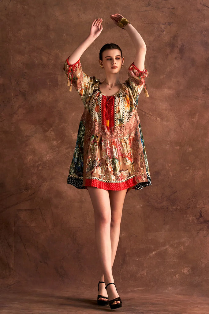 A playful multi-printed mini dress in Viscose Lurex Georgette with lace & thread detail for the diva in you.