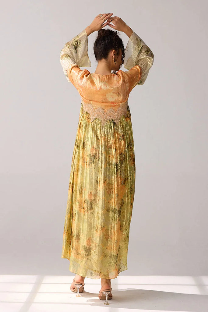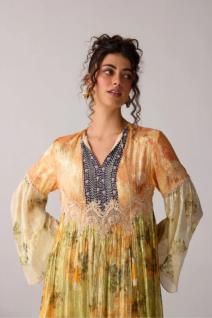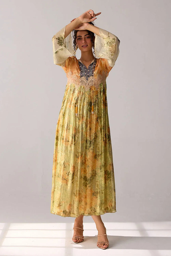 Nail that timeless glamorous look in this golden, striped lurex maxi dress, adorned with intricate thread beads and delicate lace detailing.