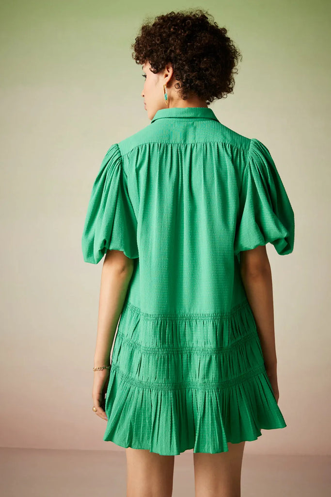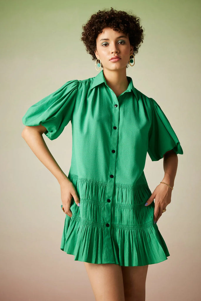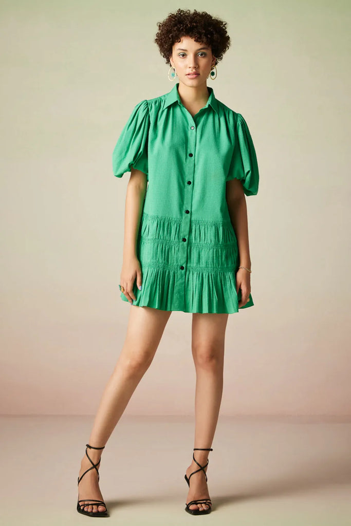 Embrace a playful and vibrant look with the Leia Mini dress. The green polyester fabric is crafted into a shirt dress style, offering a relaxed and effortless vibe. Perfect for a holiday getaway or a casual gathering, this dress exudes comfort and style. Pair it with sandals or sneakers for a trendy and relaxed ensemble.