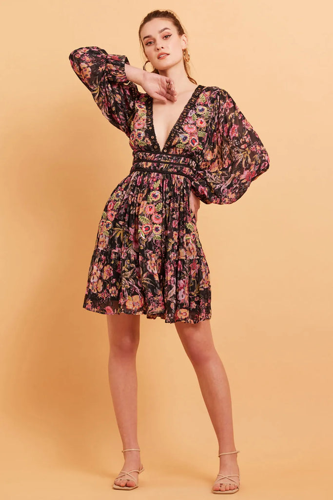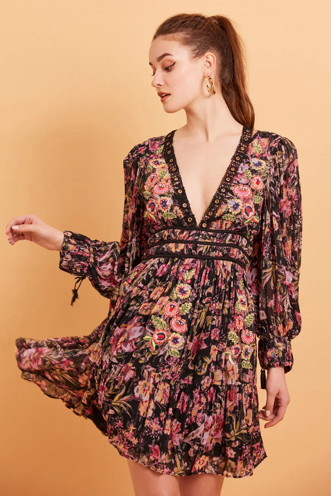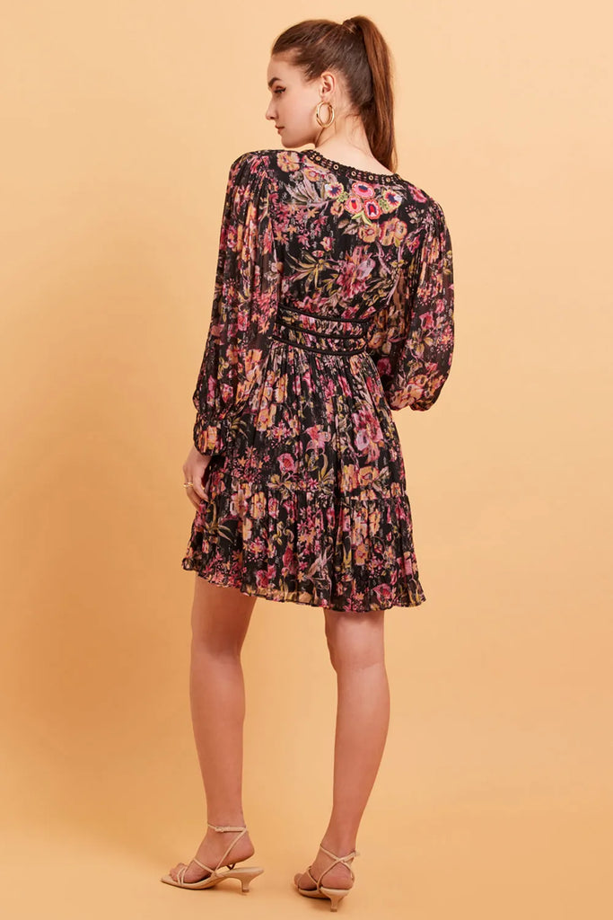 Stand out in our Manya Embroidered Beaded Printed Mini Dress in classic black viscose lurex georgette. This mini dress is perfect for holiday celebrations, adding a touch of glamour to your look.