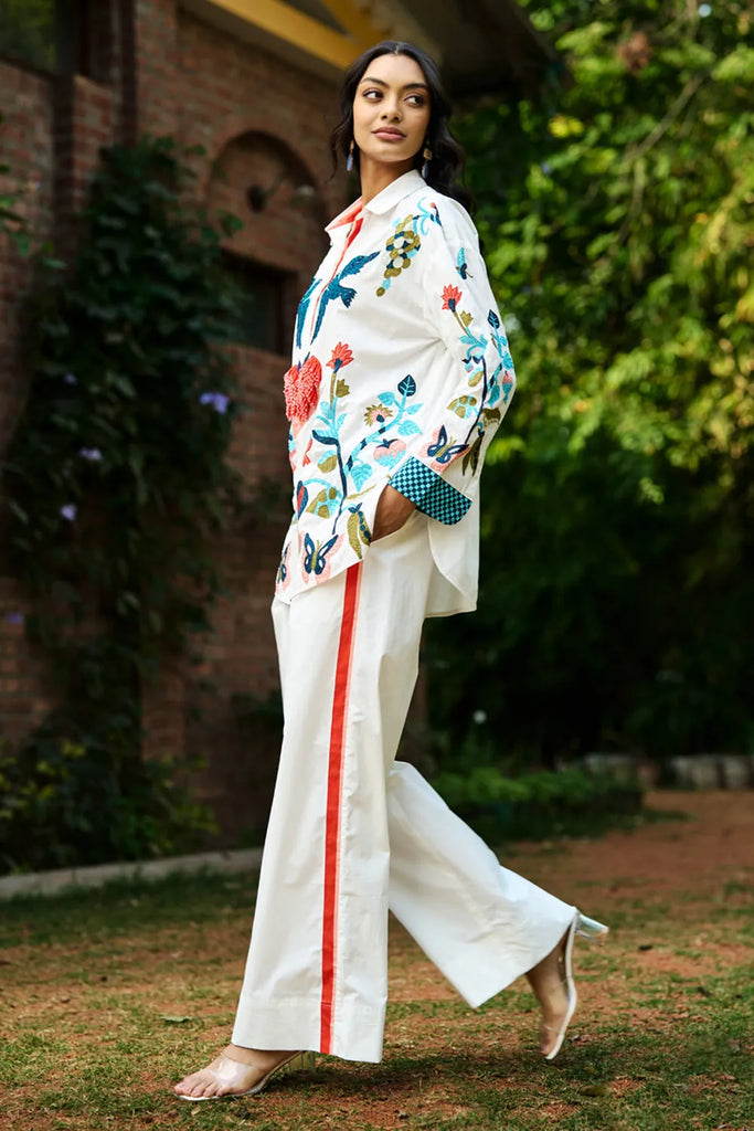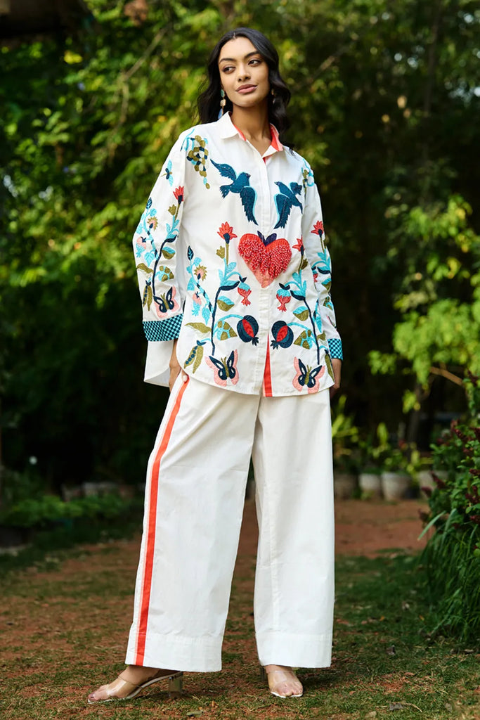 This one-size ivory floral heart placement printed shirt features intricate all-over thread, beads, sequence detailing on the front and sleeves. A stylish, timeless piece that pairs perfectly with wide-leg trousers or shorts for a chic, effortless look.