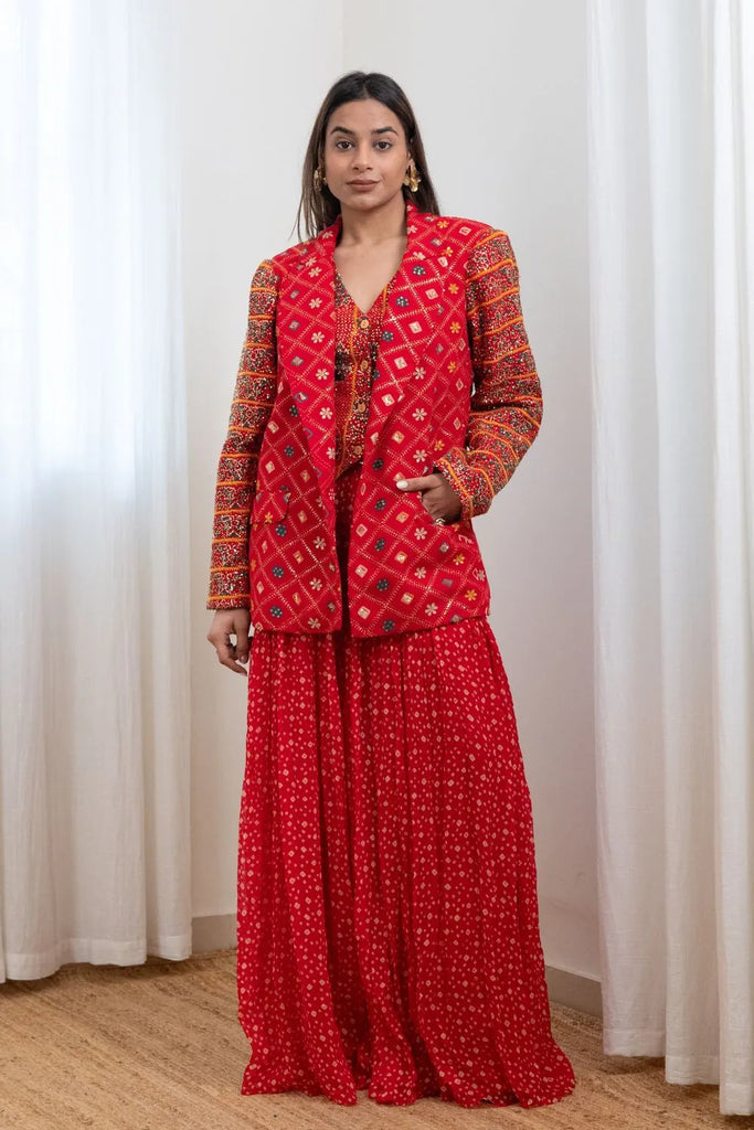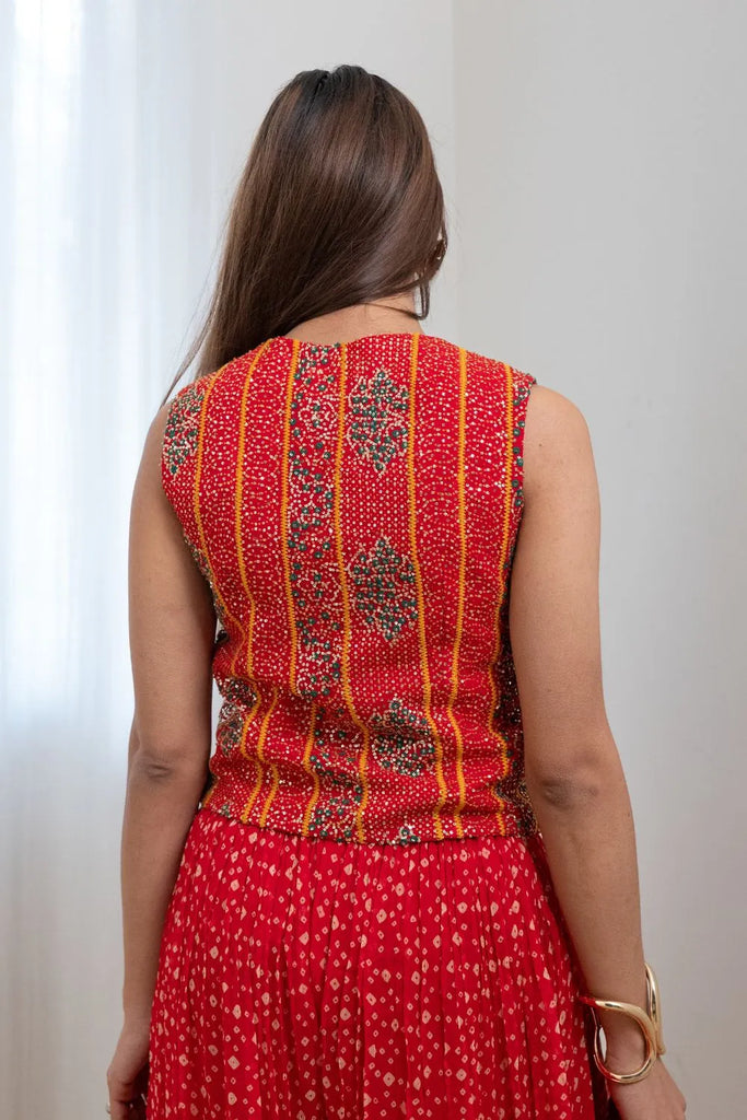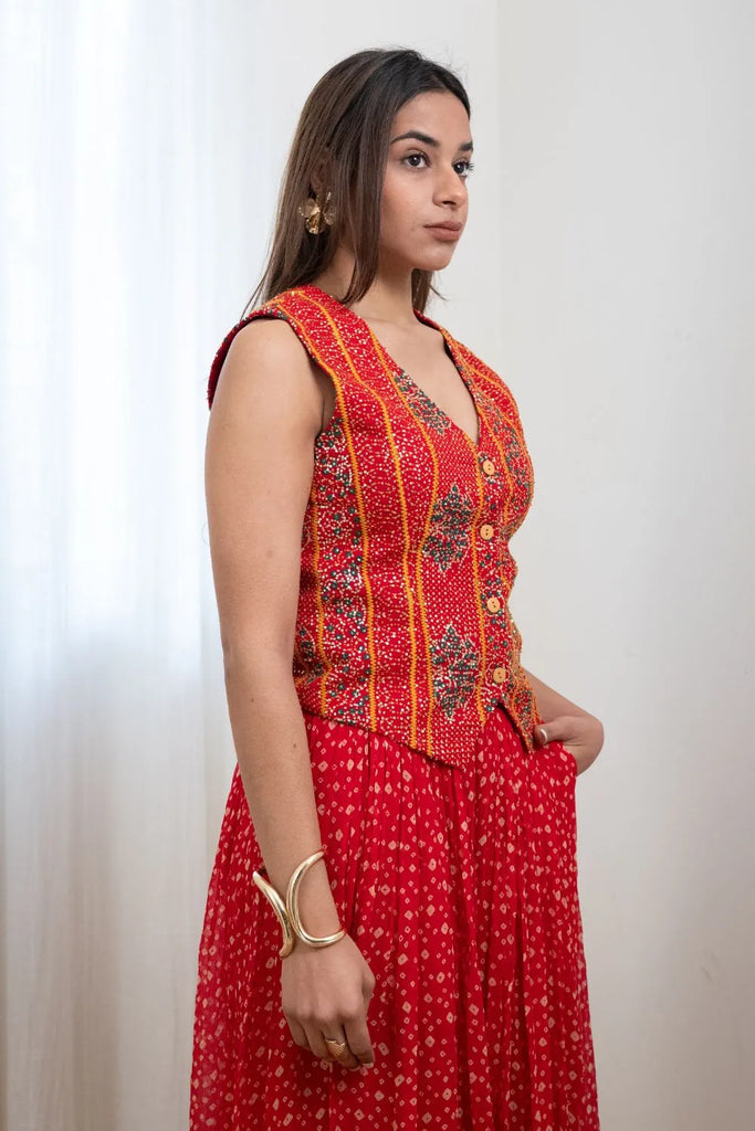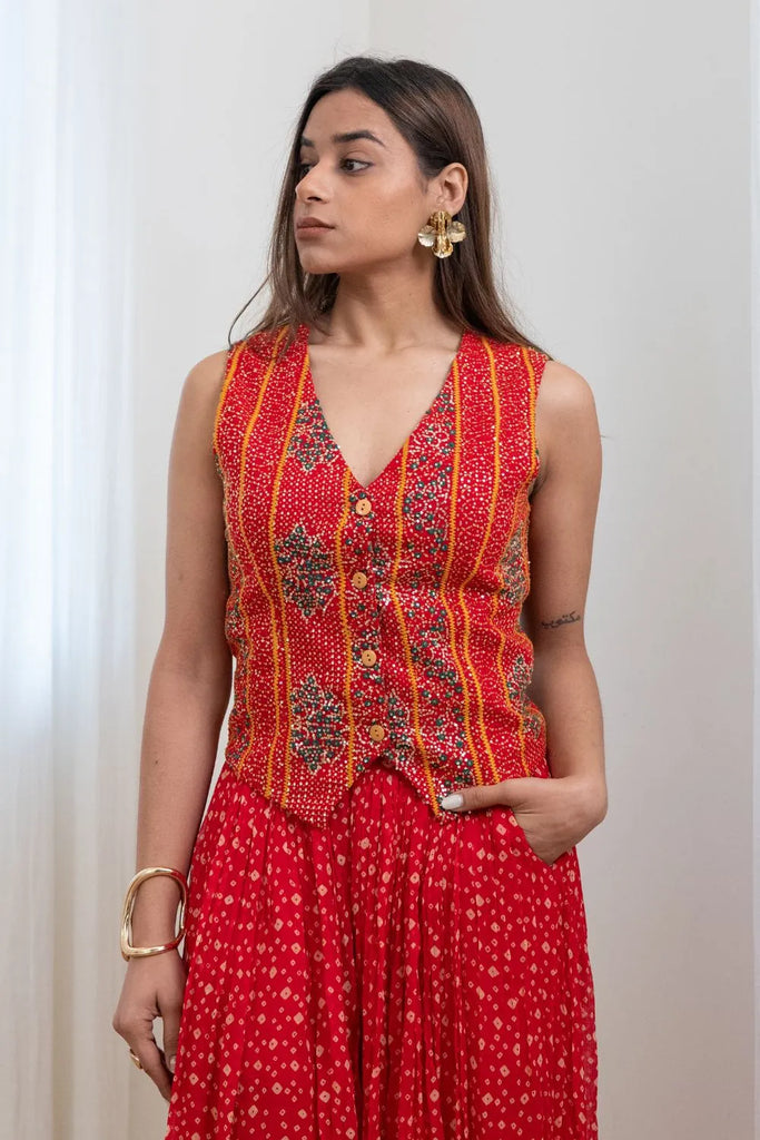 Bandhni printed vest, hand embroidered sequence work all over, paired with bandhni printed flared pants.