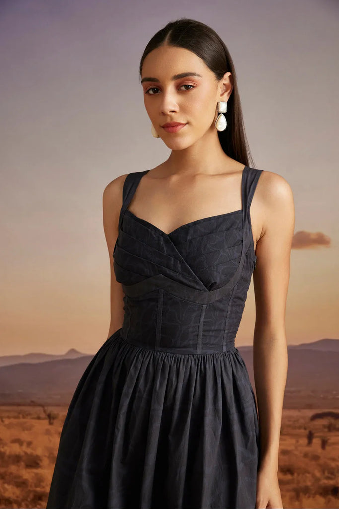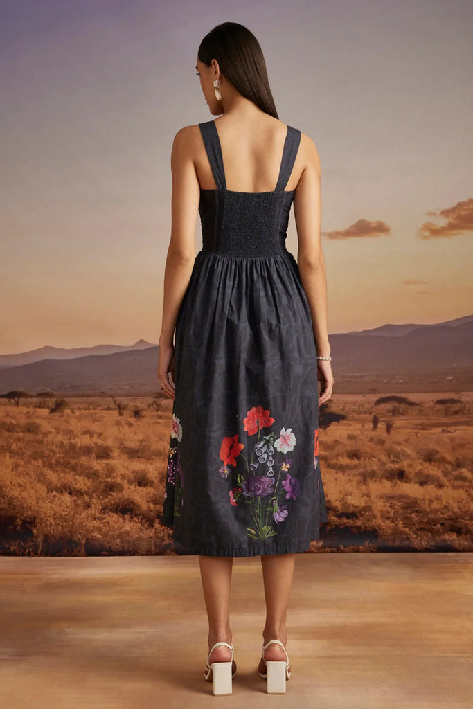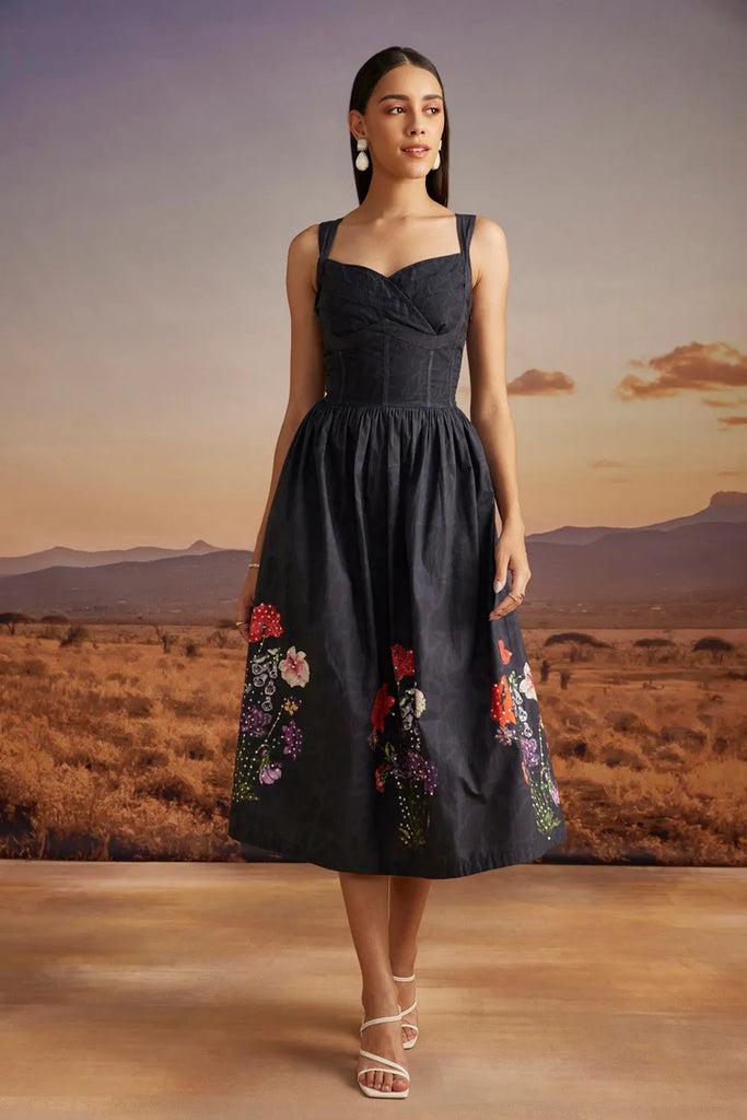 Radiate elegance in the Orsa Dress, featuring a sweetheart neckline and intricate bead detailing on a navy floral print. This cotton dress is a true work of art.