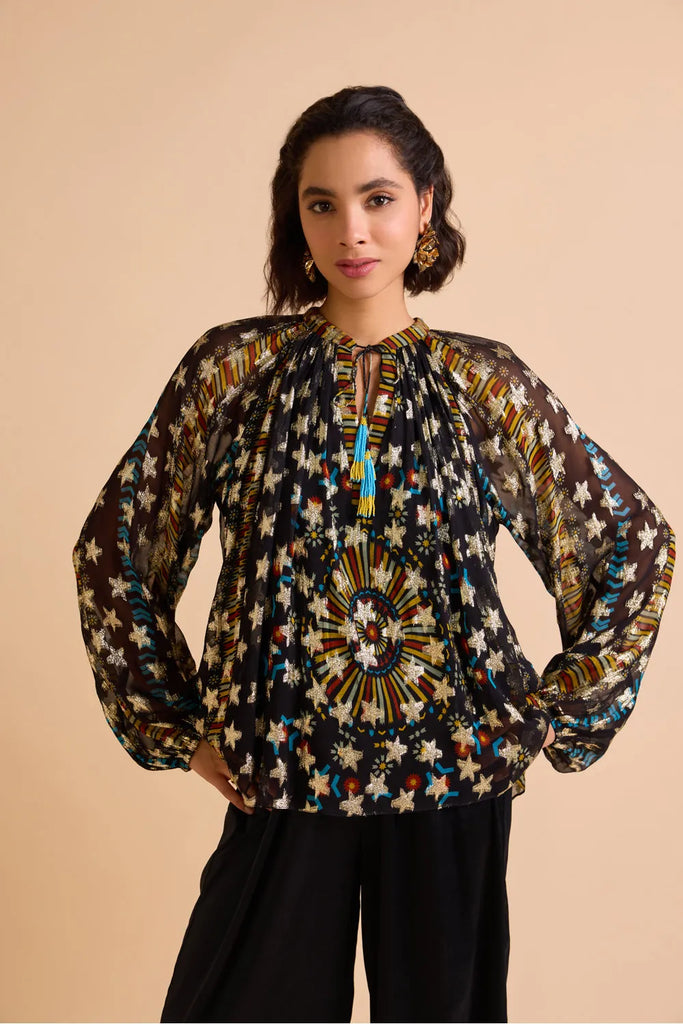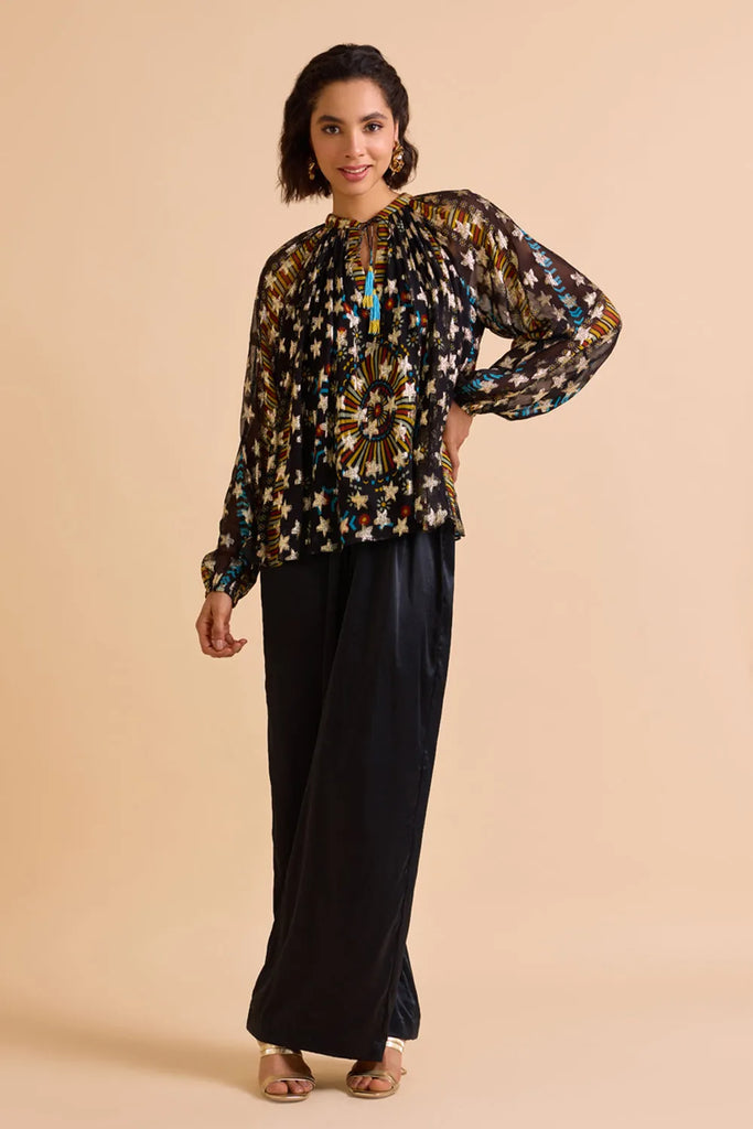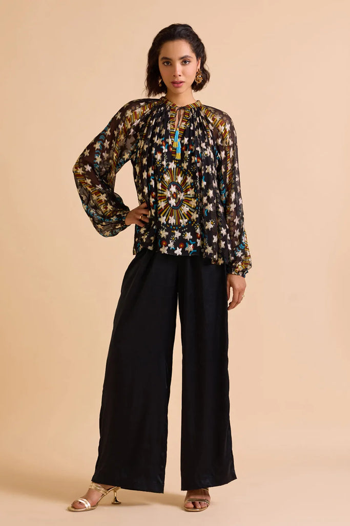 This black geometric printed jacquard blouse features a beaded tassel tie-up, adding a touch of sophistication and playfulness. Perfect for elevating any look, whether dressed up or down.
