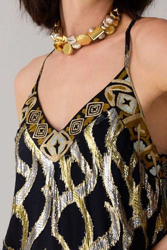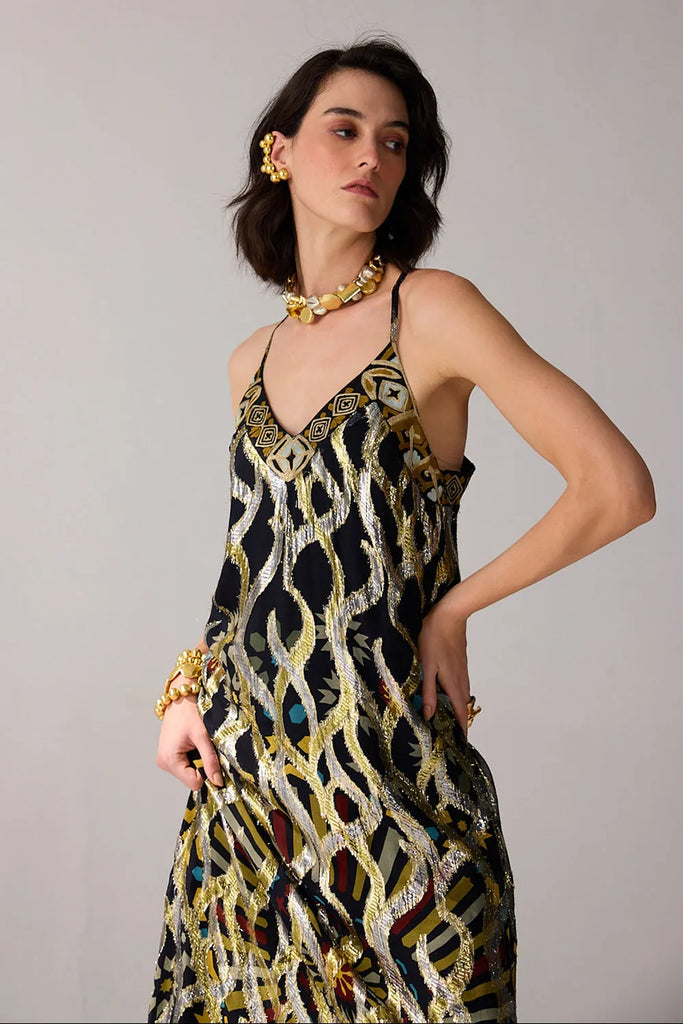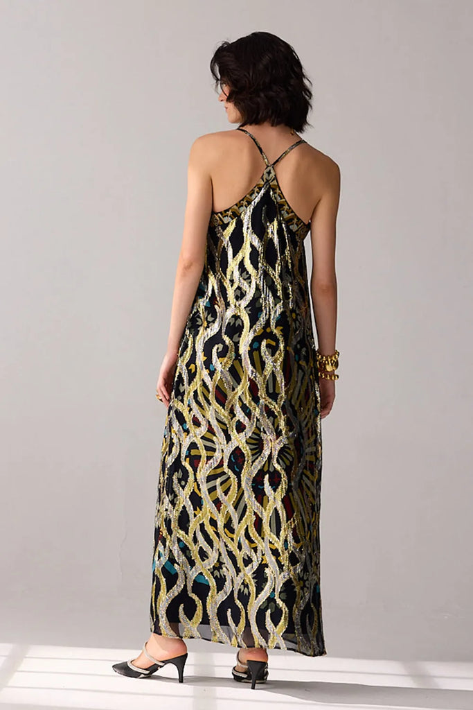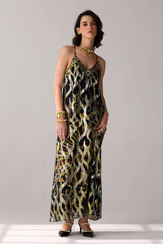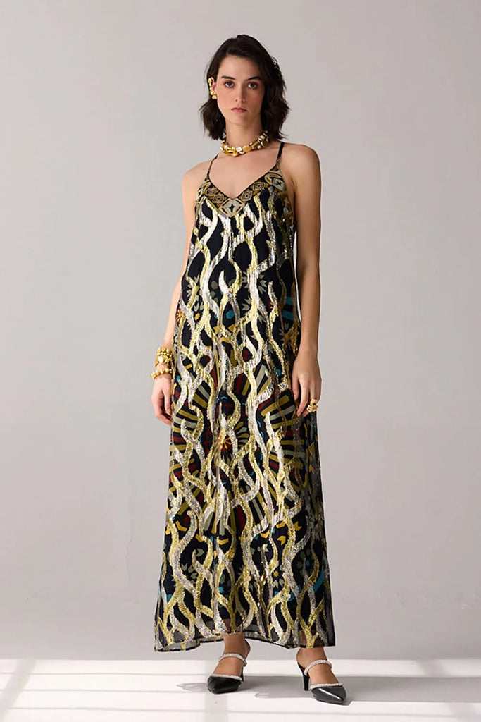 This printed black jacquard maxi dress features a stunningly detailed beaded neckline, making it the perfect choice for elegant evening wear. Sophisticated, timeless, and effortlessly glamorous.