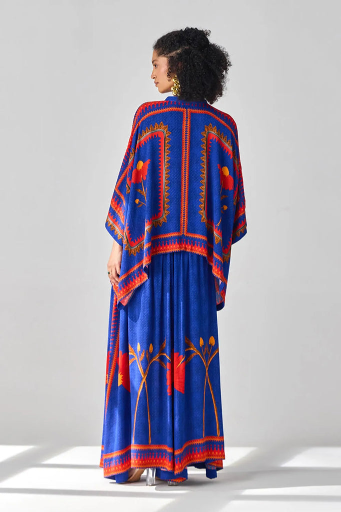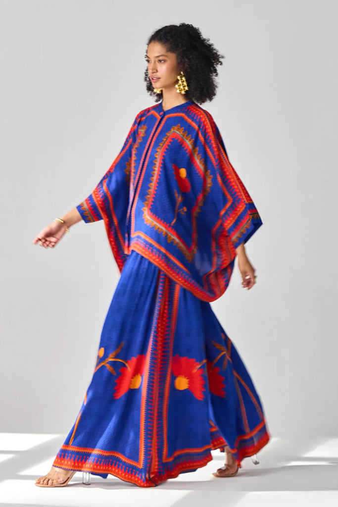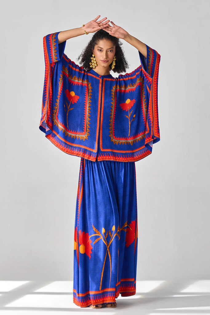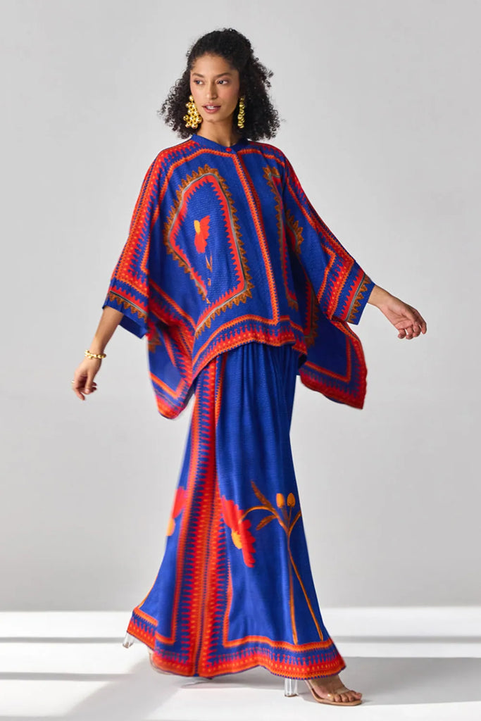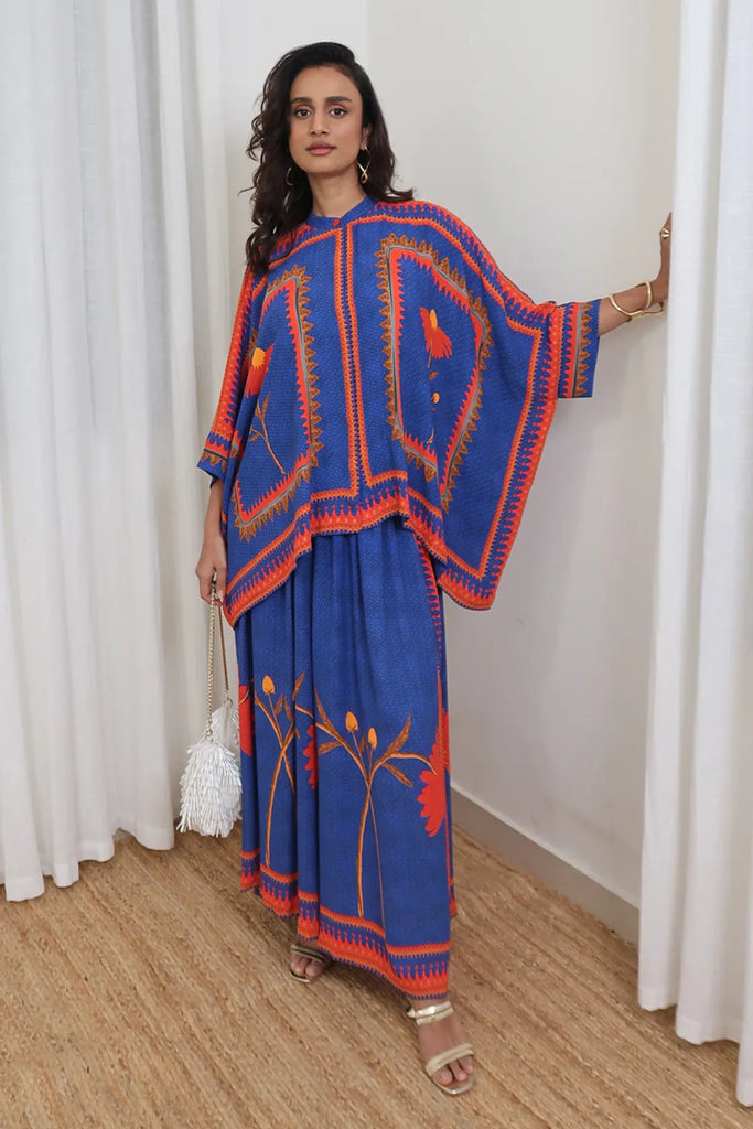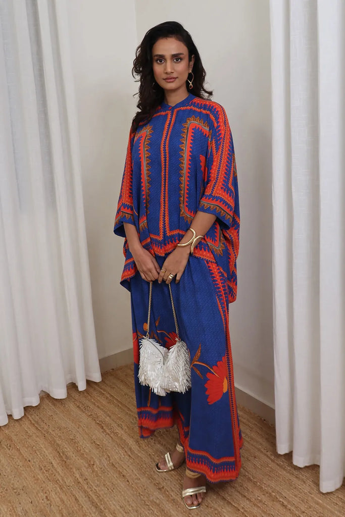 This chic co-ord set in a radiant shade of blue features a printed blouse with an intricately embroidered border along the neckline, which is paired with cotton shorts adorned with playful heart-shaped eye threadwork.