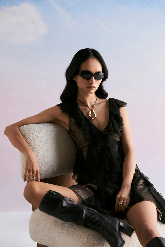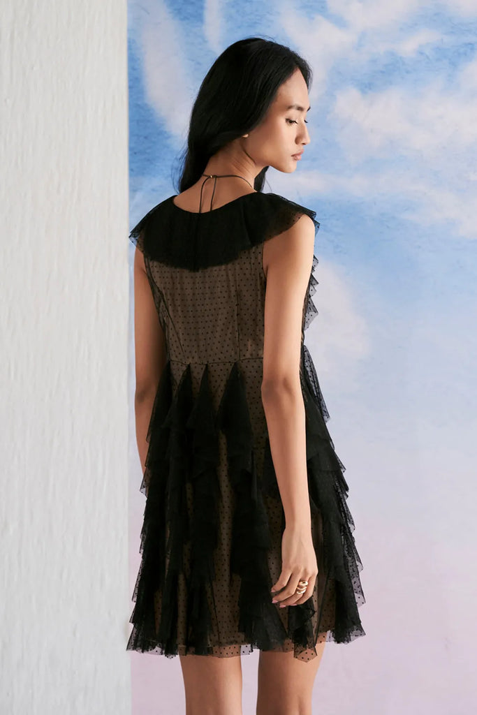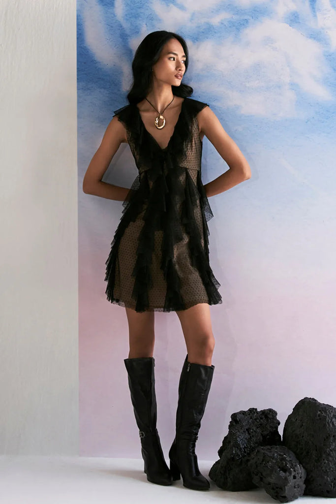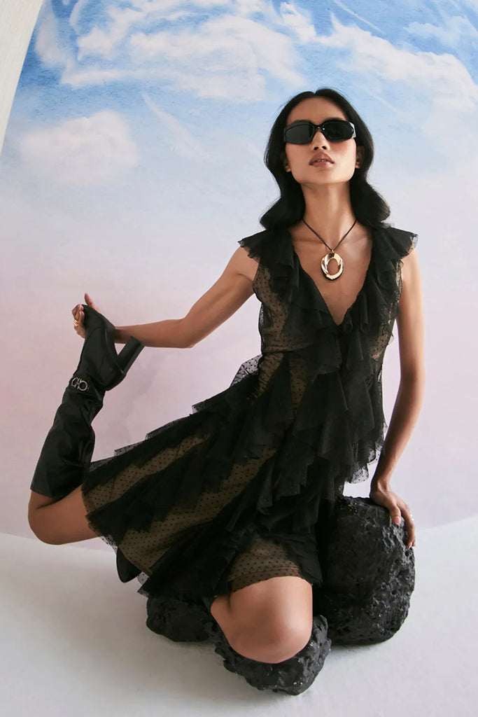 Ruffled textured tulle Mini dress with skin lining.