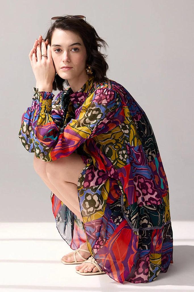 Brighten your wardrobe with our multicolored tunic dress, featuring elegant lace detailing. The vibrant print paired with delicate lace accents creates a stunning blend of colour and texture, making this a versatile pick.